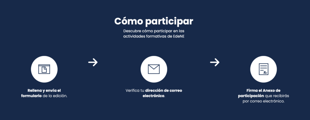 El portal web de EdeNE, www.edene.es, permite las inscripciones a sus distintas ediciones. En la pantalla de descripción de la edición se encuentra el icono INSCRÍBETE AHORA. Basta con pulsarlo para acceder al formulario de inscripción.